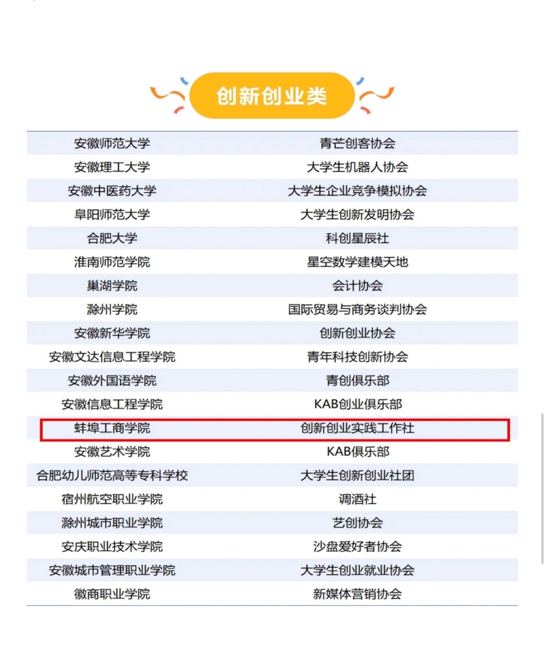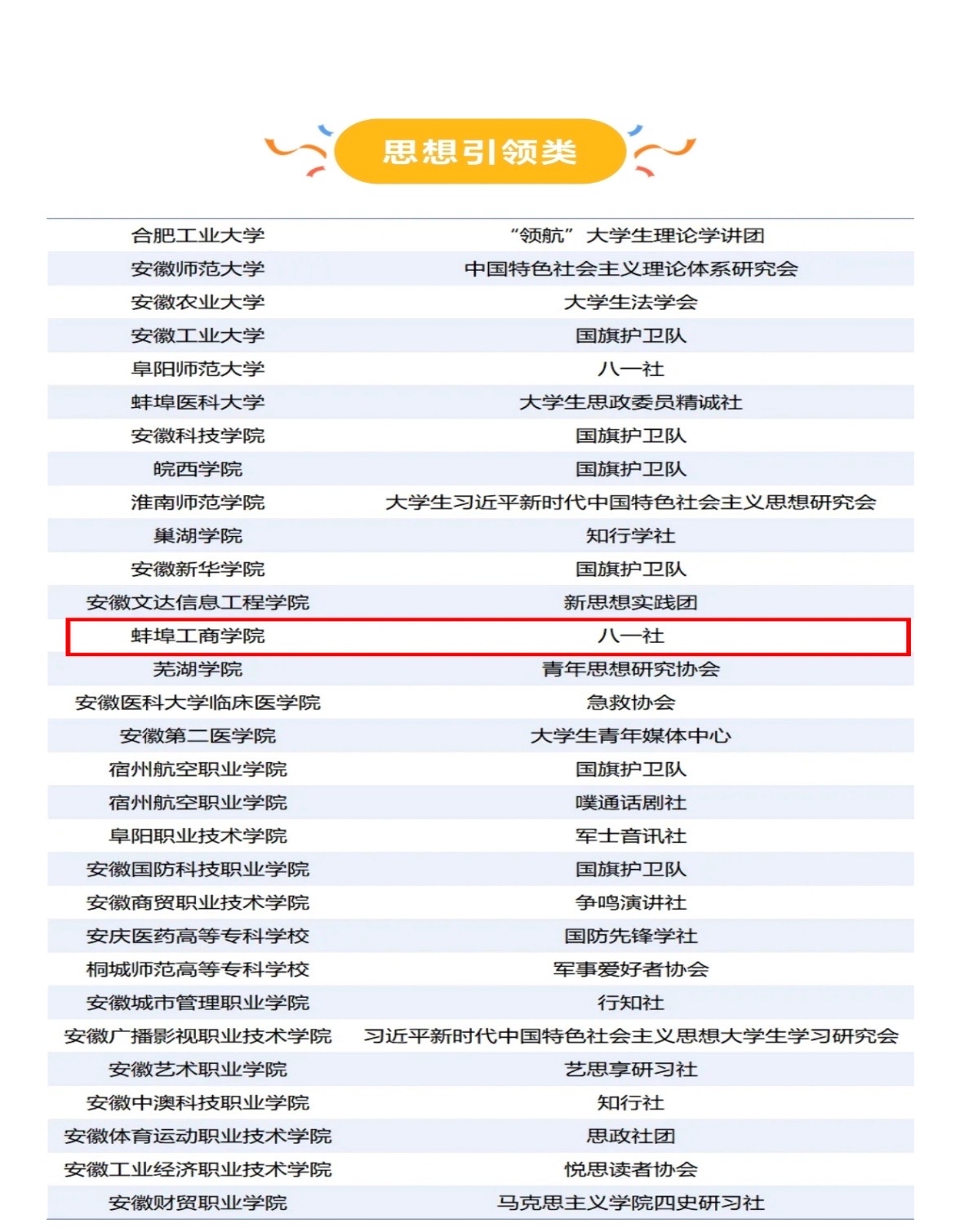 近日,由团安徽省委、安徽学联举办的2024-2025学年安徽省高校“活力社团”风采展示活动圆满落幕,经学校推荐、线上答辩、相关部门评审,我校八一社、创新创业实践工作社脱颖而出,成功入选安徽省高校“活力社团”名单。